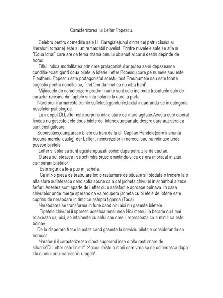 Două Loturi Caracterizarea Personajului Lefter Popescu