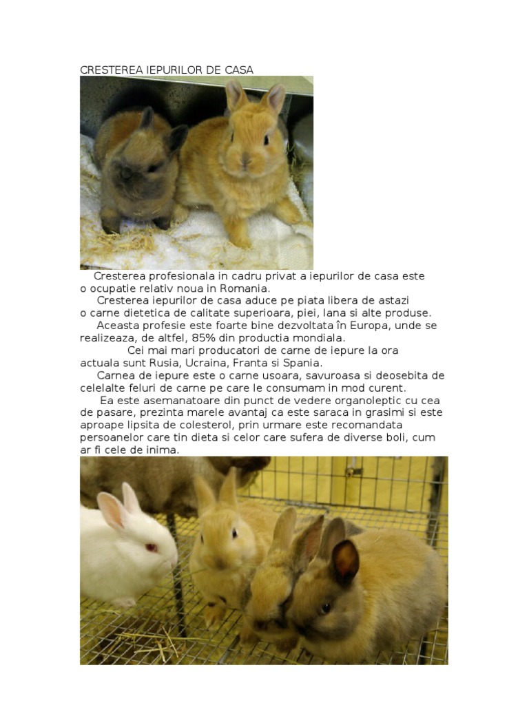 Cresterea iepurilor de casa. In mana omului viitorul animalelor domestice este plin de surprize. în aceastã broºurã vom da rãspuns la unele întrebãri mai frecvent adresate referitor la creºterea iepurilor. In continuare cateva informatii concrete pe care suntem siguri ca le vei aprecia. Cresterea iepurilor in grupuri de 8 10 femele si un mascul se face intr un spatiu imprejmuit de 15 mp amplasat la sol pe asternut de paie care se schimba o data la 1 2 ani cand se face.