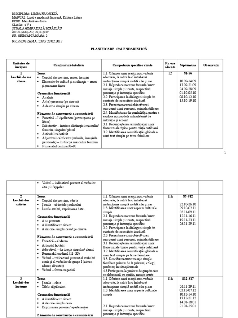 Planificare Clasa A V A Franceza Litera