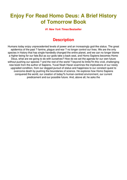 Homo deus a brief history of tomorrow pdf. Download 1 file. Yuval noah harari envisions a near future in which we face a new set of challenges. A brief history of tomorrow or read homo deus. The future of human kind.