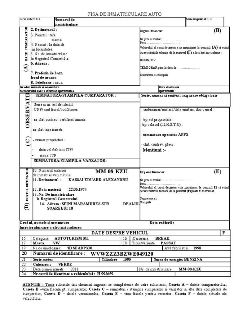 Fisa De Inmatriculare Auto