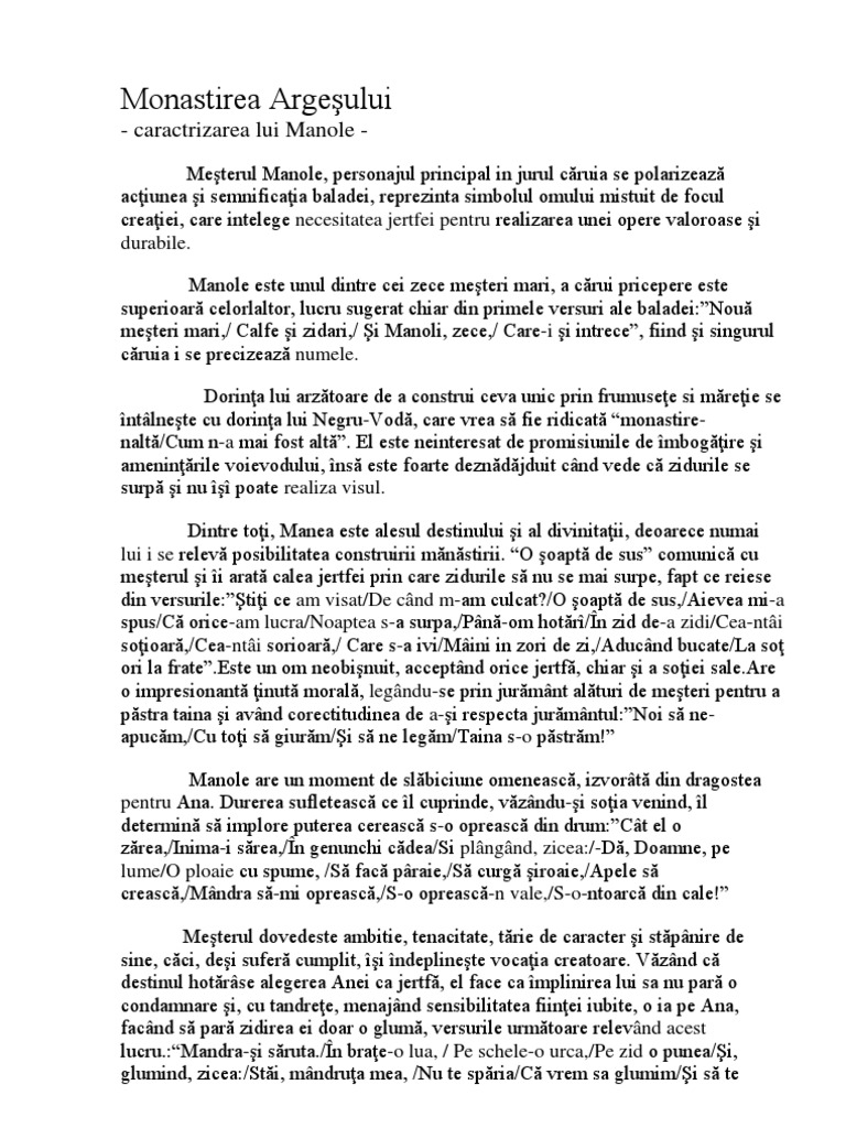 Caracterizarea Lui Manole Si A Anei Monastirea Argesului