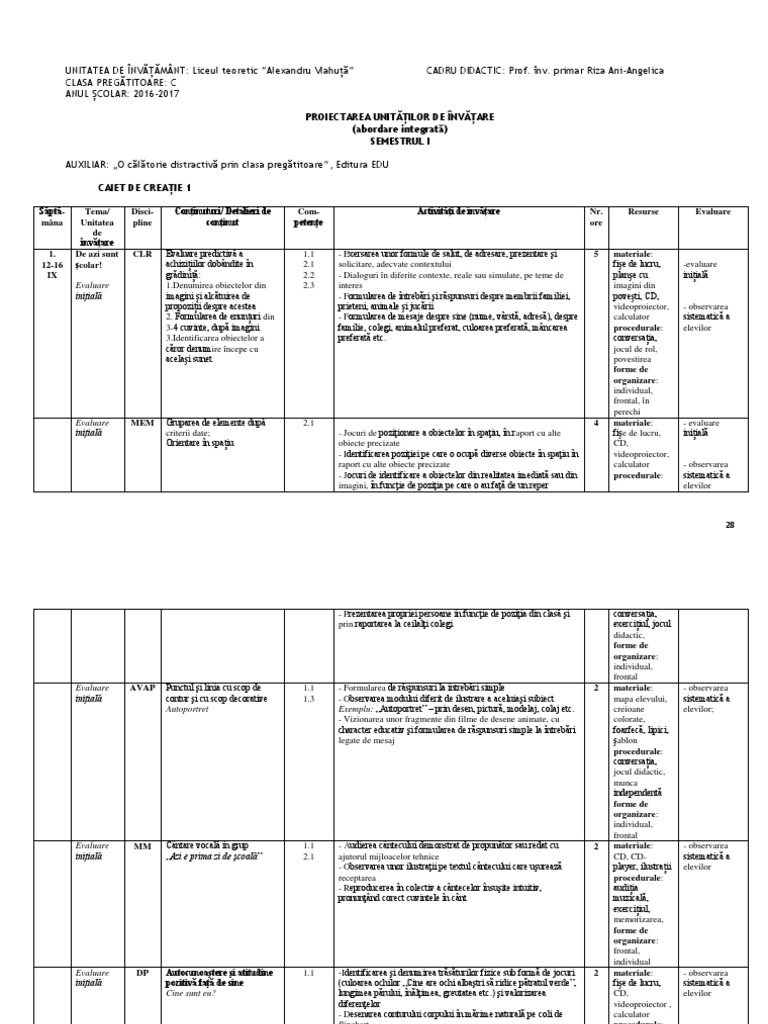 Free Clasa Pregătitoare Model De Planificare Anuală Detaliată