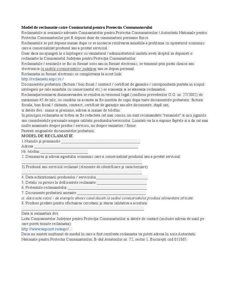 Model De Reclamatie Catre Comisariatul Pentru Protectia Consumatorului Doc