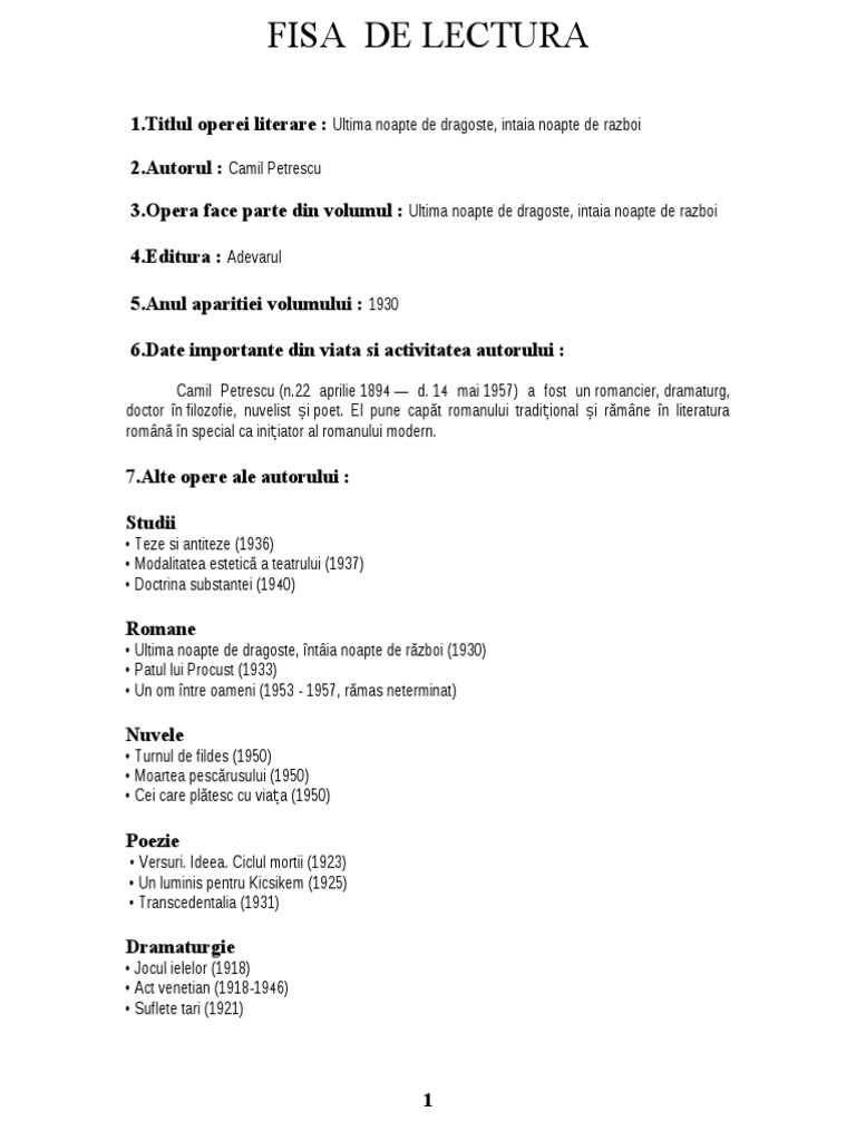 Fisa De Lectura Ultima Noapte